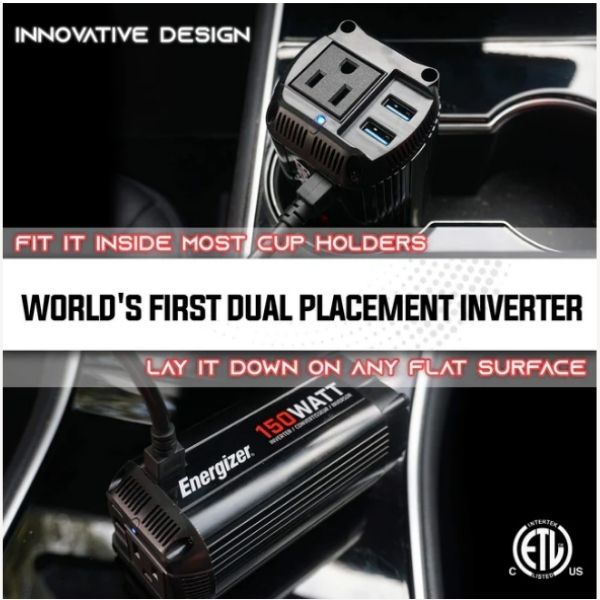 • The EN150 power inverter is ultra-compact, plugs into your vehicle's cigarette lighter DC socket and can fit securely in most vehicle’s cup holders.