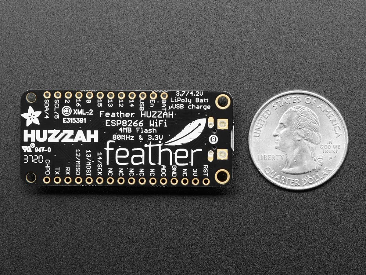 At the Feather HUZZAH's heart is an ESP8266 WiFi microcontroller clocked at 80 MHz and at 3.3V logic. This microcontroller contains a Tensilica chip core as well as a full WiFi stack. You can program the microcontroller using the Arduino IDE for an easy-to-run Internet of Things core. The USB-Serial chip is wired up for an upload code at a blistering 921600 baud for fast development time. It also has auto-reset so no noodling with pins and reset button pressings.